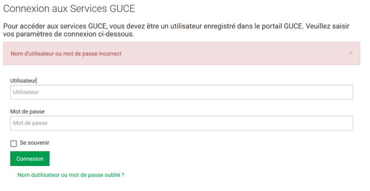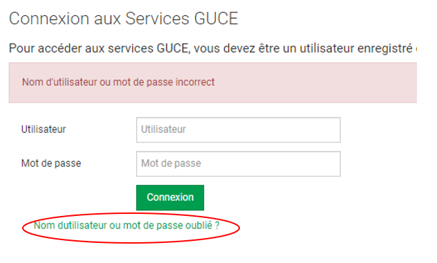du GUCE ( www.guce.gouv.ci) et vous recevez le message disant : « Nom d’utilisateur ou mot de passe incorrect », tel que représenté ci-dessous :