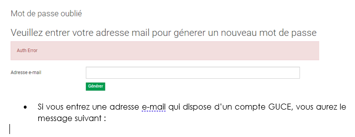 e-mail utilisée lors de la création de compte GUCE puis cliquer sur « Générer »
